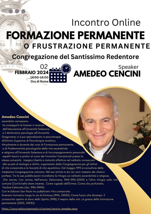 Bardzo dziękujemy naszym Braciom, Ojcom Redemptorystom z Rzymu za możliwość uczestniczenia online, 2. lutego, W Światowy Dzień Życia Konsekrowanego, w spotkaniu formacyjnym z o. Amedeo Cencini. Nasze siostry z różnych klasztorów mogły wiele skorzystać z jego wspaniałęj konferencji na temat formacji permanentnej. Jesteśmy wdzięczne i zapewniamy o naszej siostrzanej modlitwie.